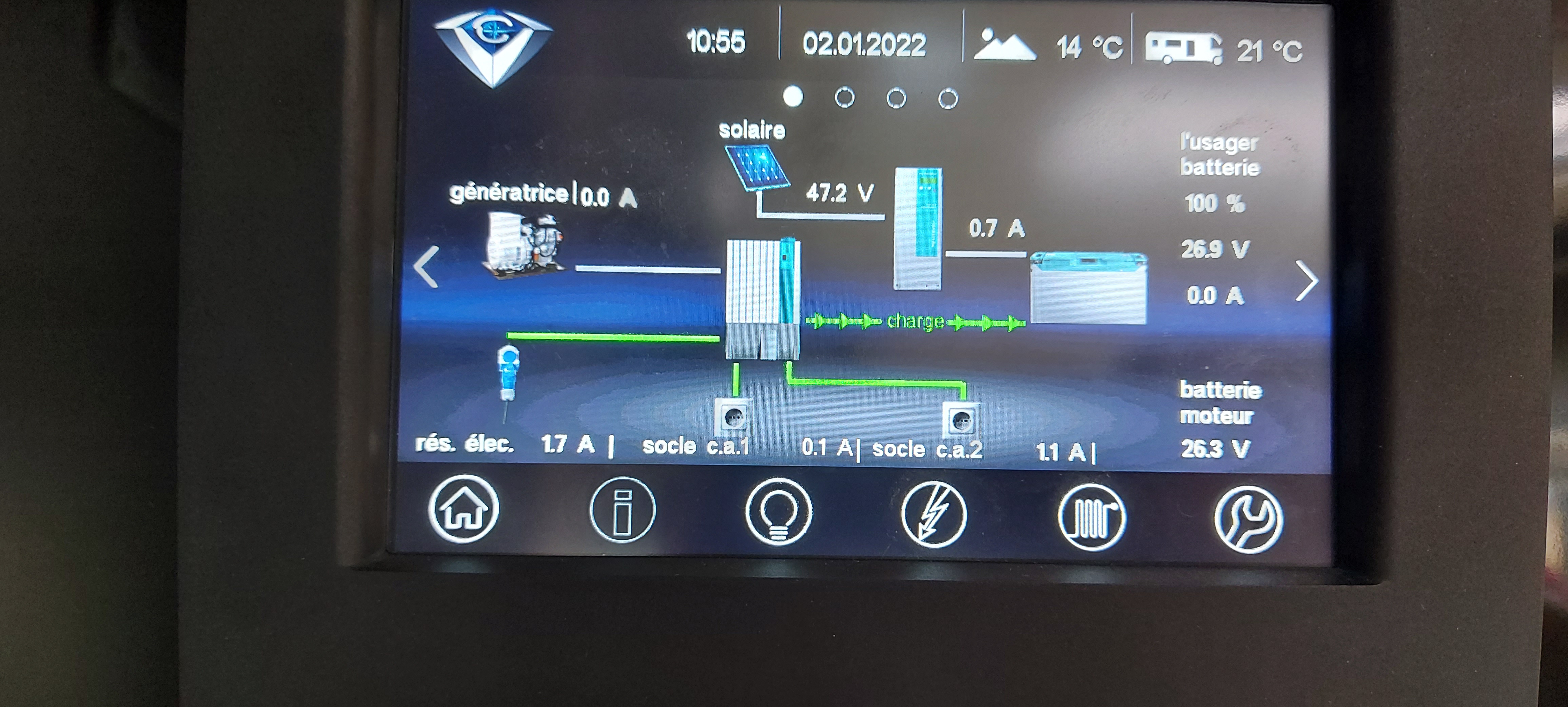 Bonjour les AMIS et merci de débattre sur mon problème de batterie, effectivement tout le monde a raison sur le principe, pour le radiateur électrique il consomme environ 1100 Watts ,je suis bien passé par le convertisseur qui alimente mes prises électriques installées dans la cellule a partir du convertisseur et sans aucune autre source d'alimentation électrique branchée pendant mes essais. Je pense comme vous ,la batterie est fatiguée et je doit vous informez que le CCar est resté 1 an (cause COVID) sur le parking du concessionnaire avec la batterie dessus mais la prise + n'était pas adaptée mais juste posée ,ce que je n'ai pas oublié de leur signalé car cela pouvez endommager la batterie et même le régulateur du panneau solaire. Si vous avez des questions je suis preneur, je pense également que cette batterie serra prise sous garantie car j'ai 1 an de garantie sur ce Ccar d'occasion. La tension maxi est de 13.7 au tableau pour 100% de charge avec branchement sur le secteur 220 volts. Merci pour vos réponses.
