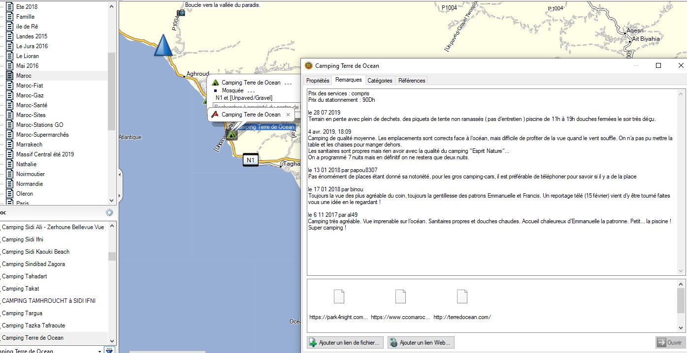 Par contre pour les campings et aires, après les avoir récupérés et intégrés sous Basecamp, je les complètent avec d'autres données et surtout les commentaires récents récupérés ICI mais également sur PARK4NIGHT et voilà ce que cela donne ...