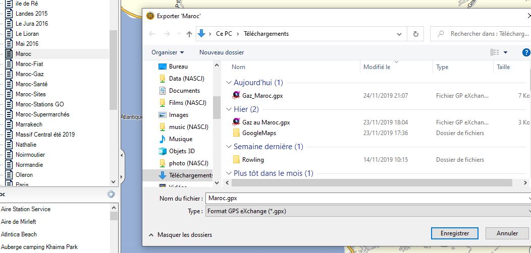 Ensuite je peux exporter mes listes ici le maroc en format .GPX, .KML, .CSV