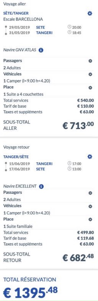 Nous avons choisi une suite plus agréable qu'une petite cabine juste avec deux lit et un cabinet de toilette sans aucune vue et j'ai payé : 1387 euros pour le départ Sète/Nador + le retour Tanger/Sète + assurance annulation (environ 50 euros - facultatif mais à notre age....) pour camping-car de moins de 9 m. et deux passagers)