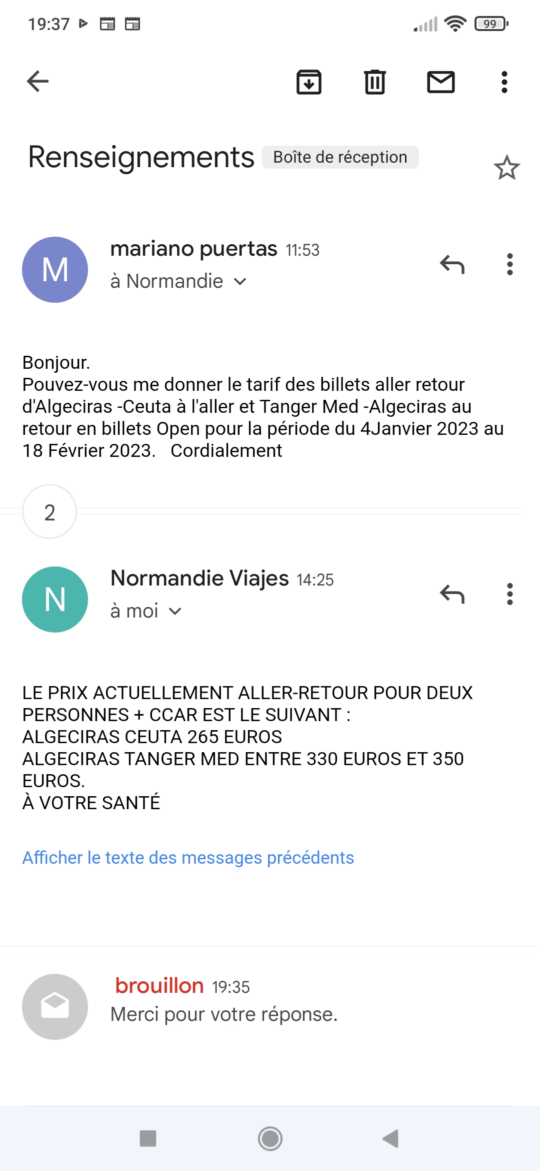 Aujourd'hui j'ai redemandé à Mr Guttierez les tarifs pour le départ le 4 Janvier et retour le 17 février. Partir par Ceuta et retour par Tanger Med. Voici sa réponse.