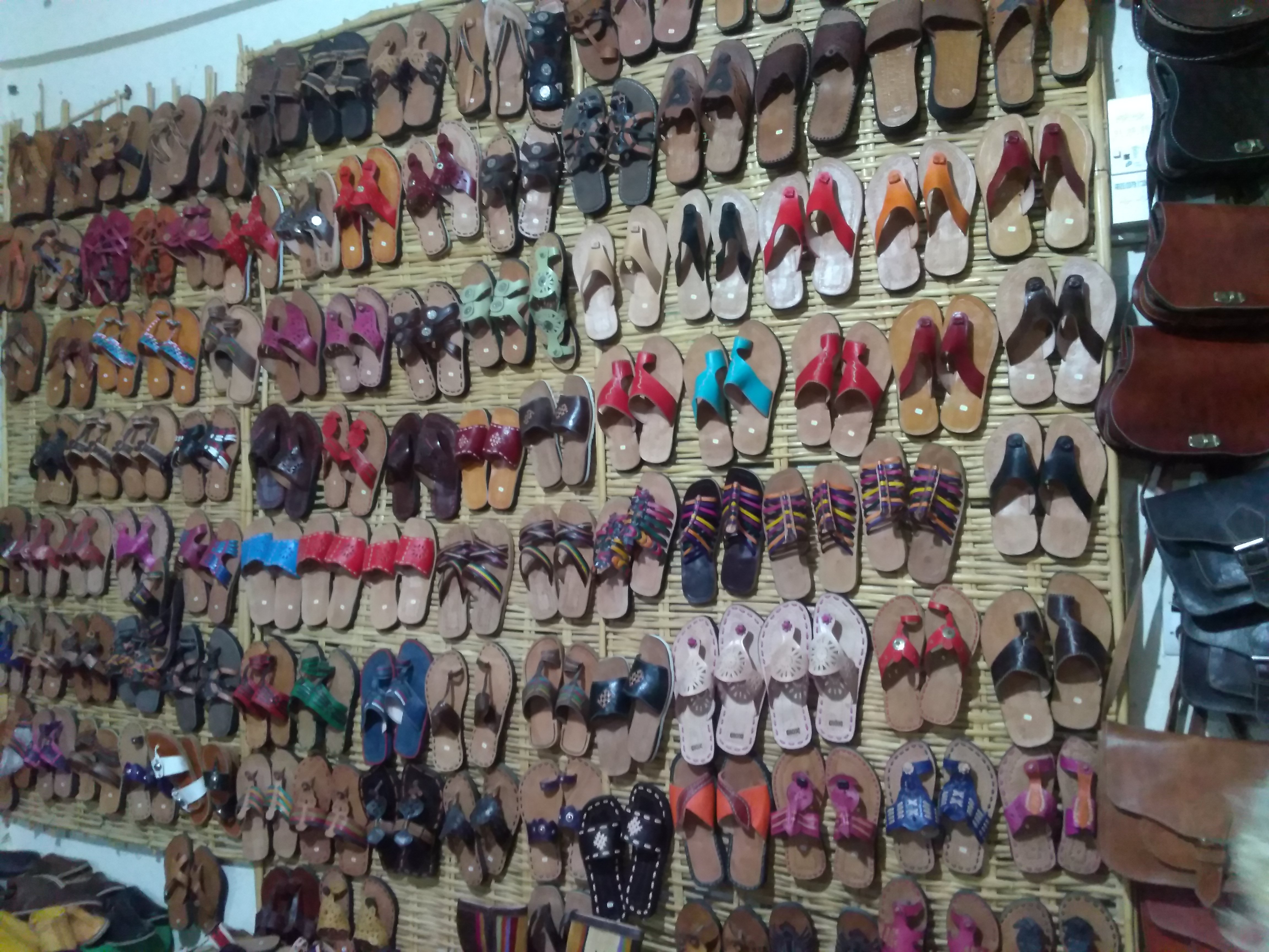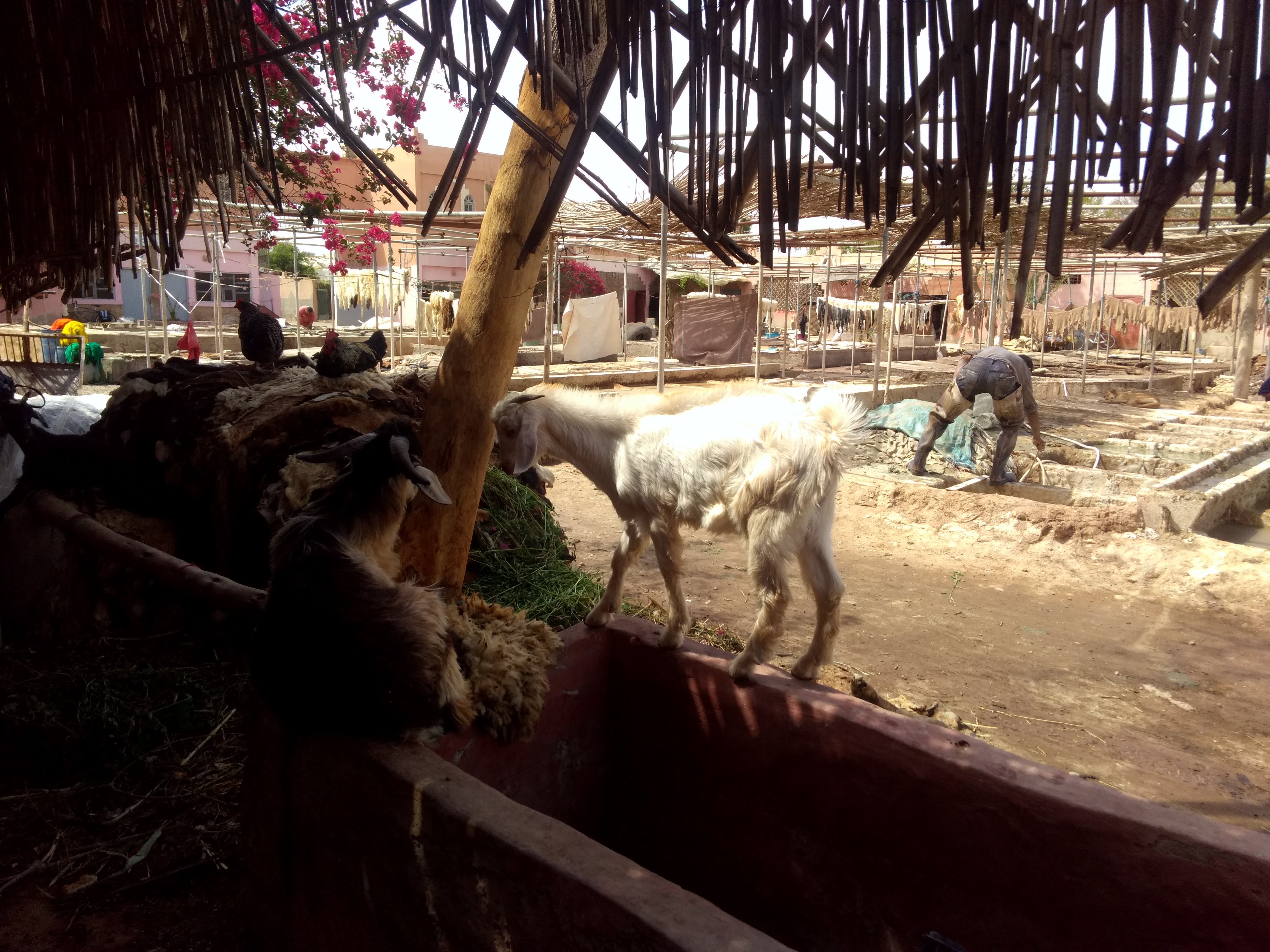 Autour d'une cour fermée où sont travaillées les peaux, il y a de nombreuses petites échoppes d'artisans pour la vente directe. Le choix est important et les prix peu élevés. Cette chèvre ne sait pas quand sera son tour! Voir adresses :