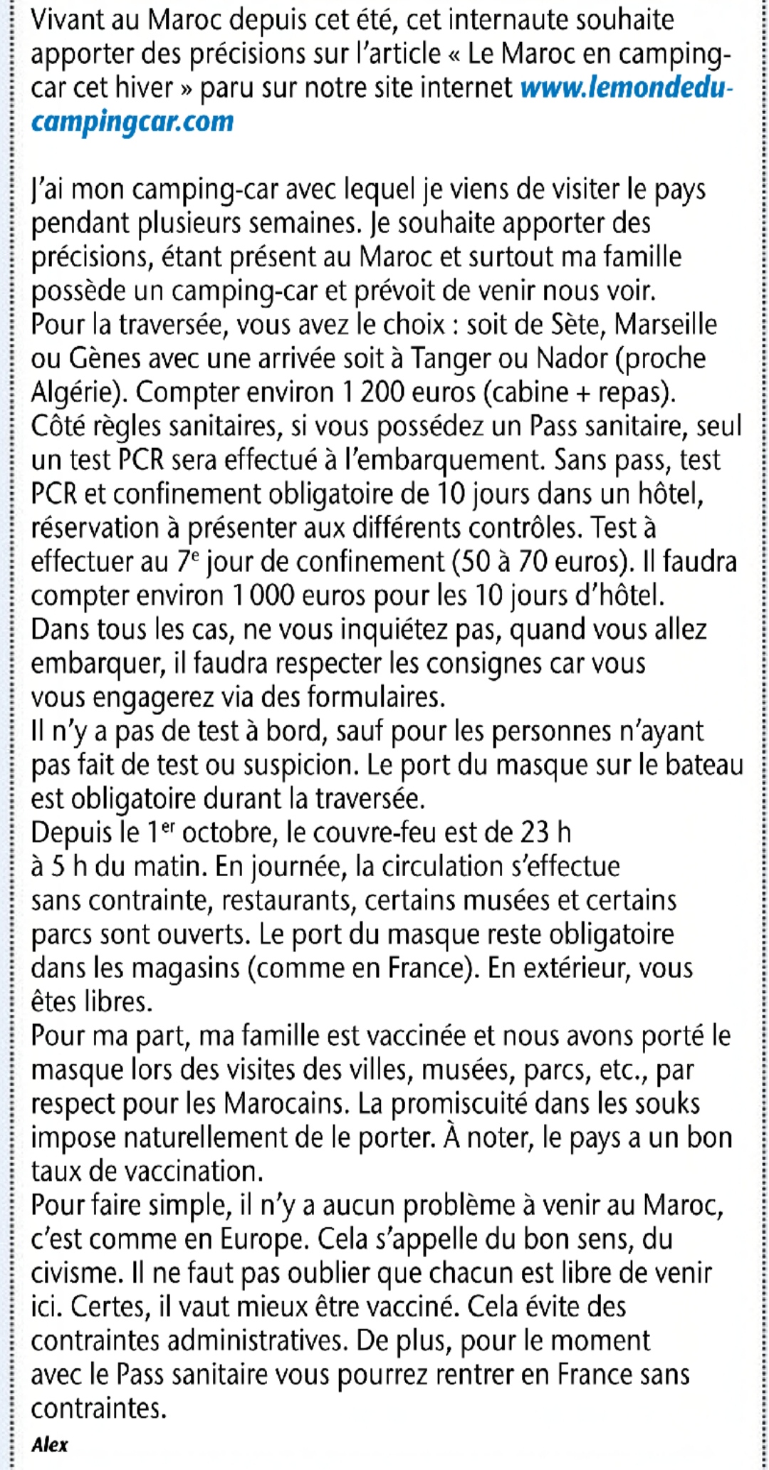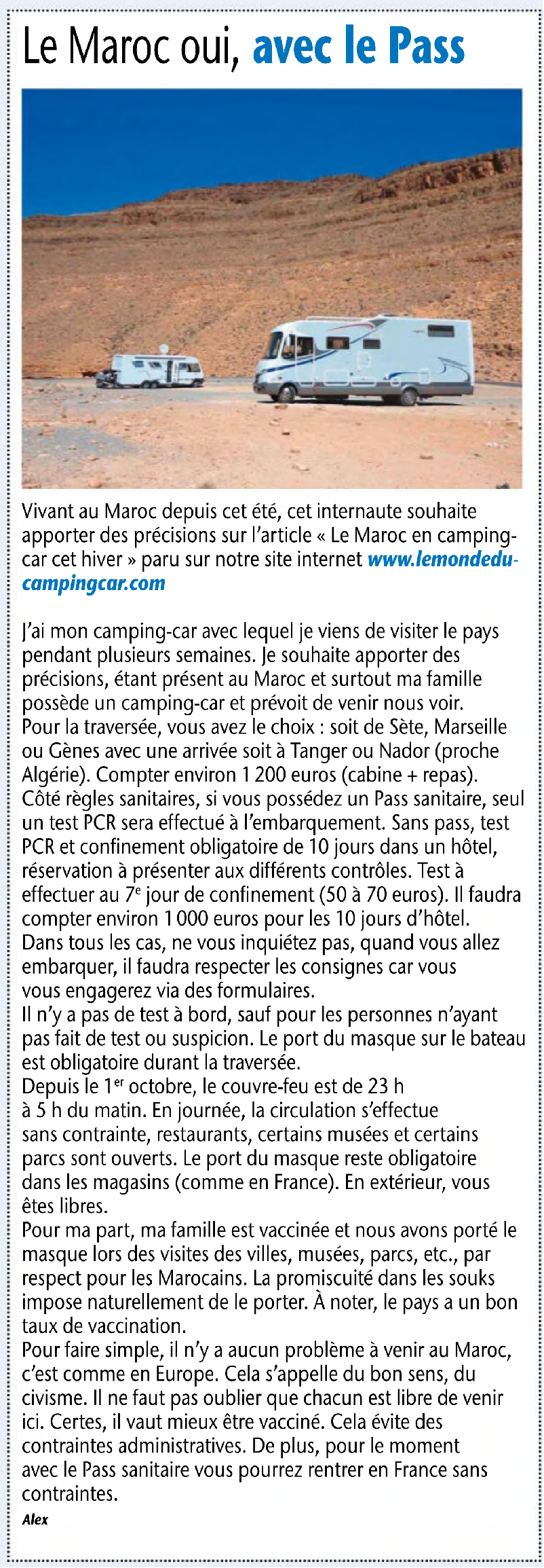 Il s'agit toujours de la même revue, celle qui a publié des saloperies sur Dakhla (dont je certifie qu'elles sont fausses) et qui publie des articles et vidéos dithyrambiques et archi manipulatrices sur la liberté de la vie en camping cars, dissimulant, entre autre, les difficultés grandissantes de stationnement, et la quasi obligation en Europe d'aller dans les campings. La liberté en prend un coup. J'ai visionné une de leurs nombreuses vidéos totalement bidonnées dans laquelle une famille, dont c'était la première expérience camping-car, stationnait le premier soir tout près de la mer et passait la nuit sur un espace très étroit et dangereux en bordure de route. Tout était angélique... Ignoble cette revue. Ils doivent certainement toucher des subsides des constructeurs.