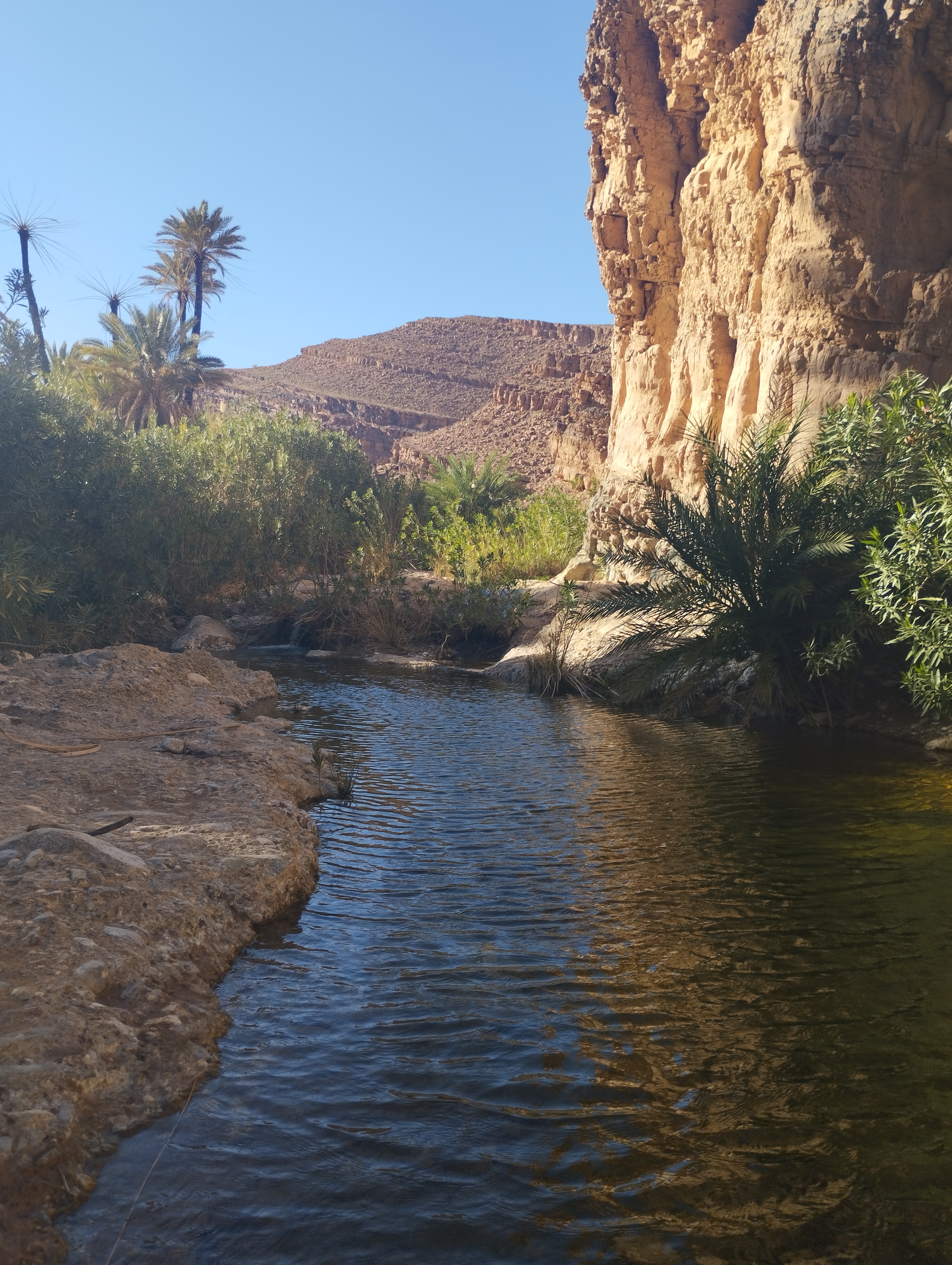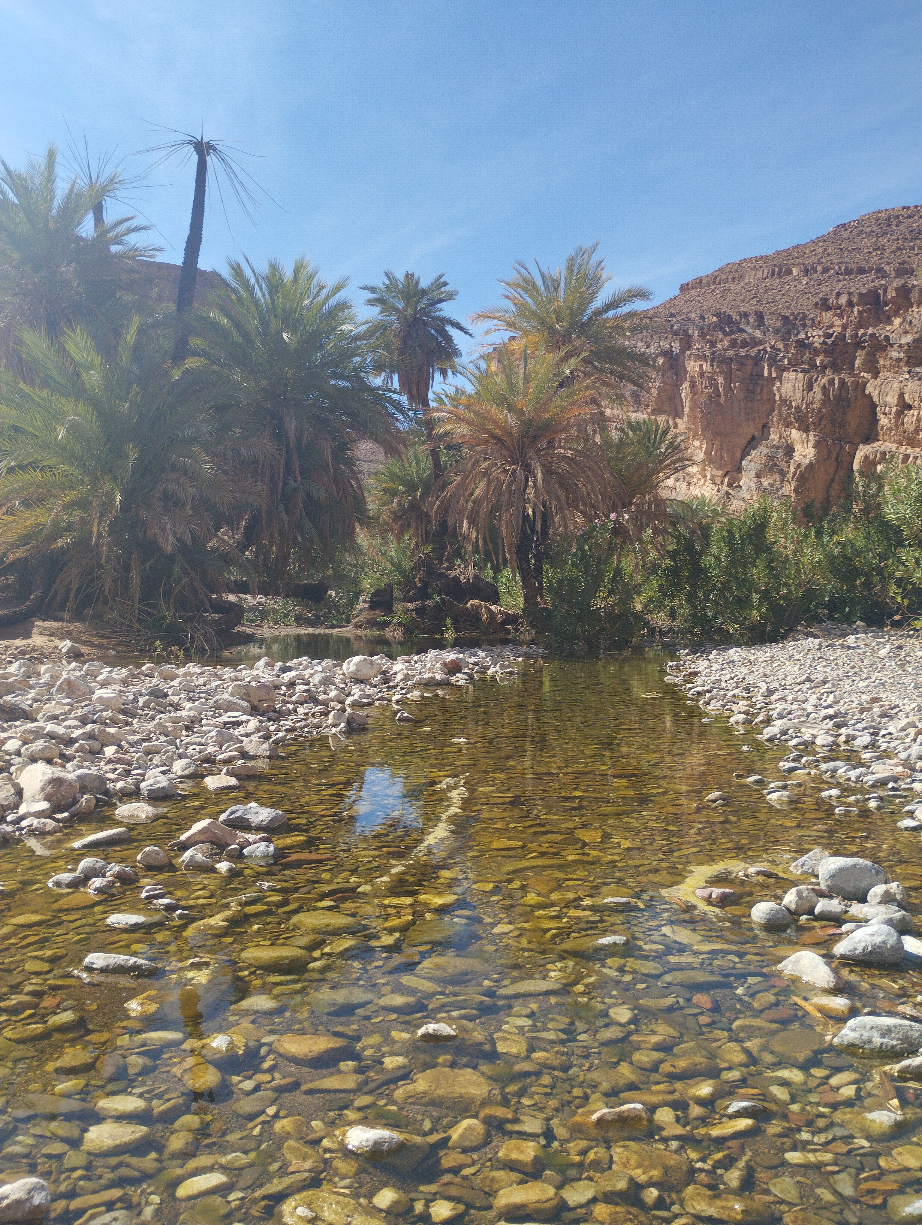 Oasis accessible à pieds ,à vélo (plutôt type VTT ,bien que les marocains y aillent avec de vieilles bécanes déglinguées ) ,et en 4x4 . (Un oued de pierrailles à traverser et une rue etroite en raison d'un poteau de rue dans le village ) .