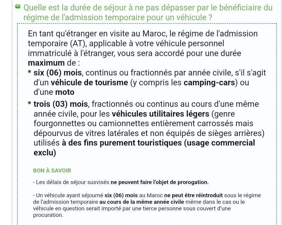 ...il y a du changement a la douane, pour les vehicules les calculs sont sur l'année en cours donc cet année j'ai le droit jusqu'au 26/1/24 il faudra aller a Agadir pour faire le complément car je sort du maroc fin mars encore une nouvelle complication...