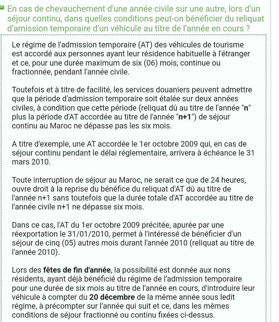 il y a du changement a la douane, pour les vehicules les calculs sont sur l'année en cours donc cet année j'ai le droit jusqu'au 26/1/24 il faudra aller a Agadir pour faire le complément car je sort du maroc fin mars encore une nouvelle complication