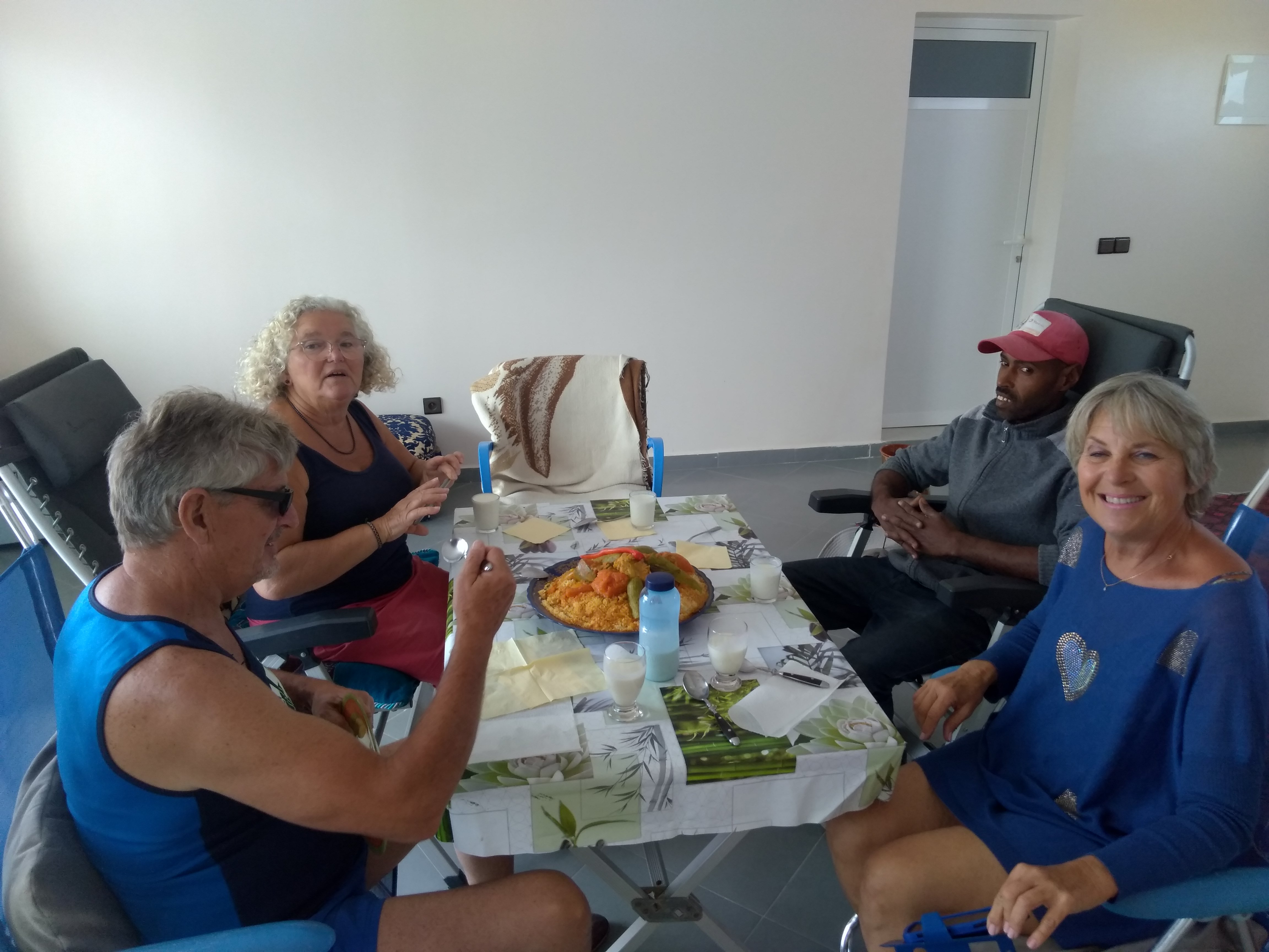 Aujourd'hui vendredi couscous préparé par la sœur de Hassan, installés dans le salon du camping à l'abri du vent !