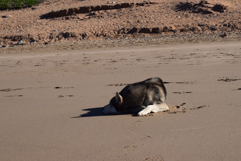 Un malamute mollement affalé sur le sable de le plage de Tifnit :