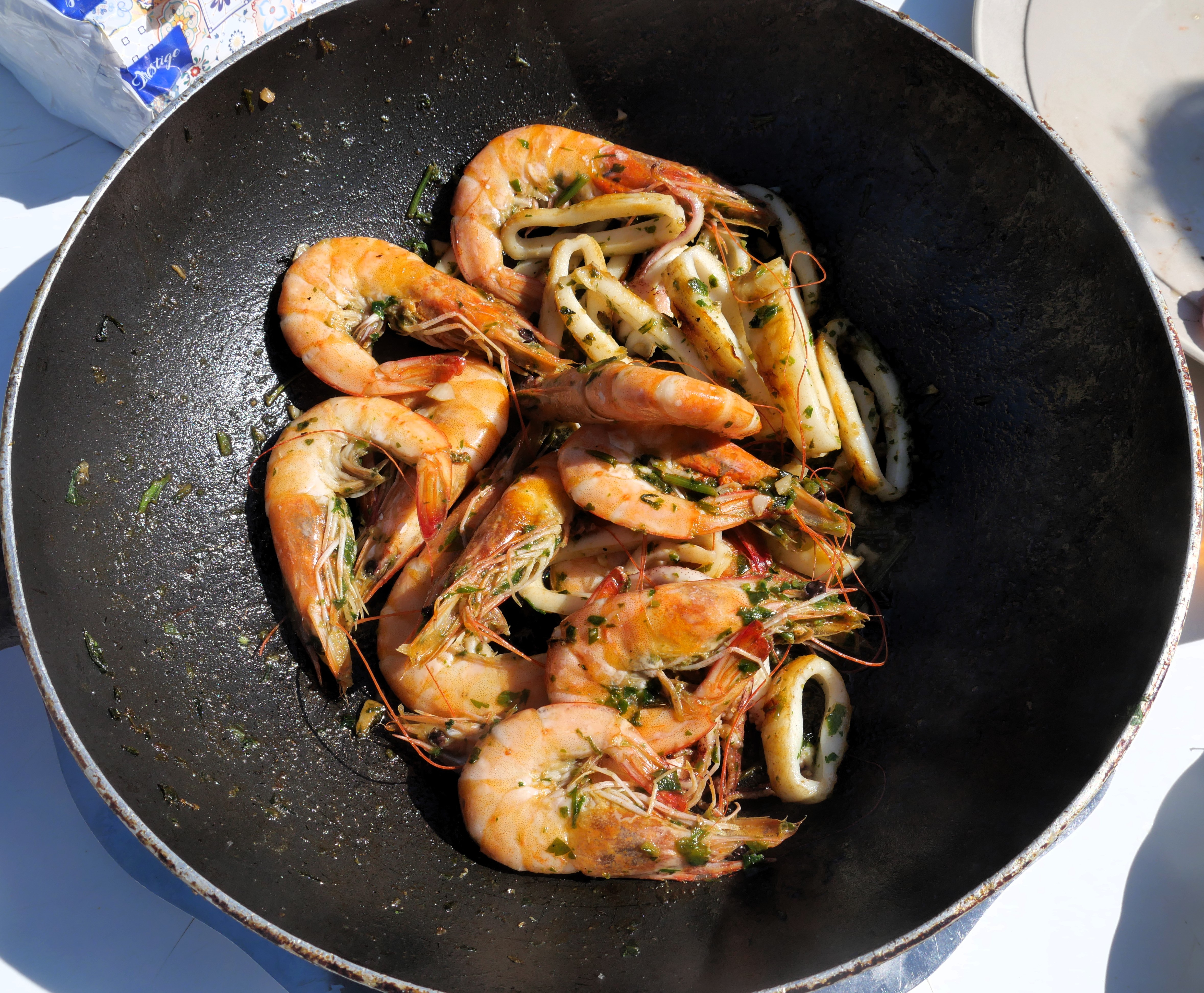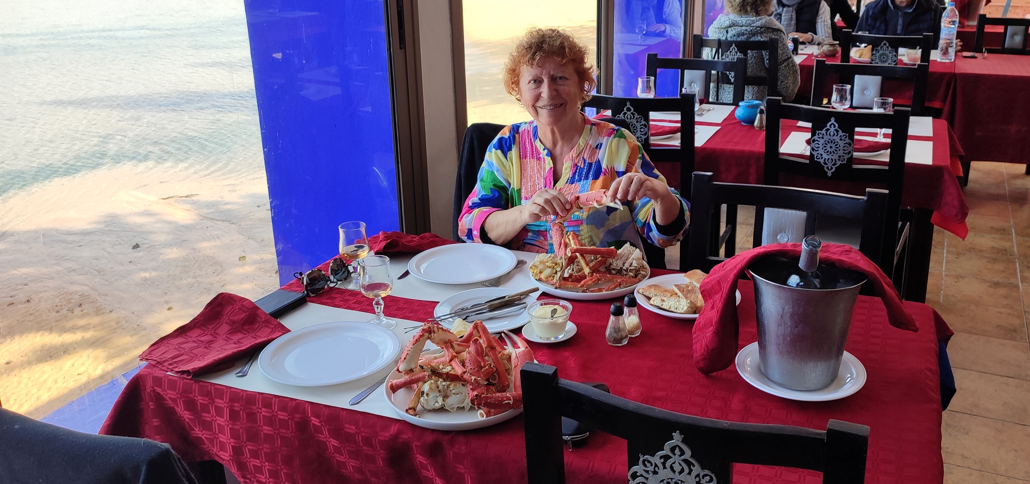 Bonjour ! non on va pas prendre des kgs car on marche beaucoup et le poisson grillé et crustacés c'est très bon pour la santé ! encore une bien belle journée ensoleillée, petite marche de 6km fin matinée pour se mettre en appétit sommes montés jusqu'au resto "au Crabe" pour réserver mercredi... à 13h déjeuner à l'Araignée Gourmande" où nous aimons déguster une belle grosse araignée ! Il vaut mieux marcher avant car après on a plutôt envie de rester tranquillou à lézarder au soleil !