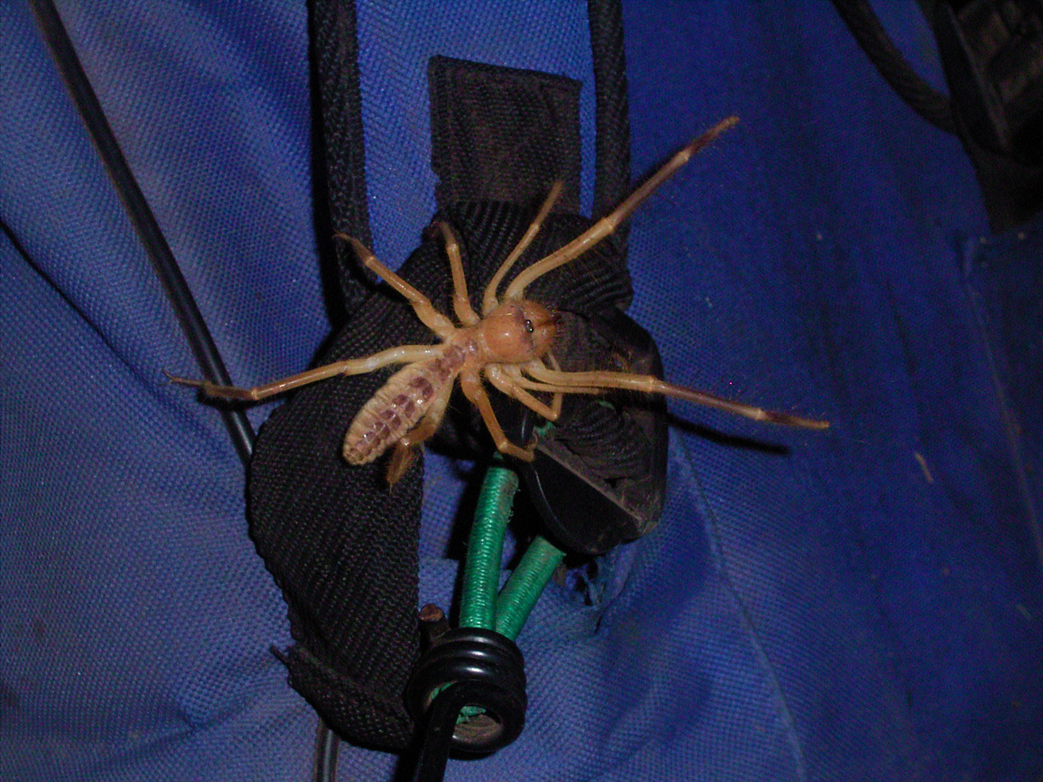A deux reprises je me trouve nez à nez devant le fourgon avec des araignées dont l'avant ressemble à un scorpion (j'ai d'abord pensé à des scorpions, mais sans aiguillon à l'arrière et les pinces avant beaucoup plus fines) . La première fois, vu que je ne connais pas la bestiole ni son degré de dangerosité, j'ai fait appel à quelqu'un pour me débarrasser de l'intruse, la seconde fois, j'ai procédé moi même.