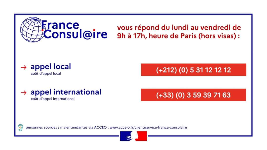 Et voici le lien de l'ambassade qui permet d'avoir les coordonnées des consulats de France au Maroc