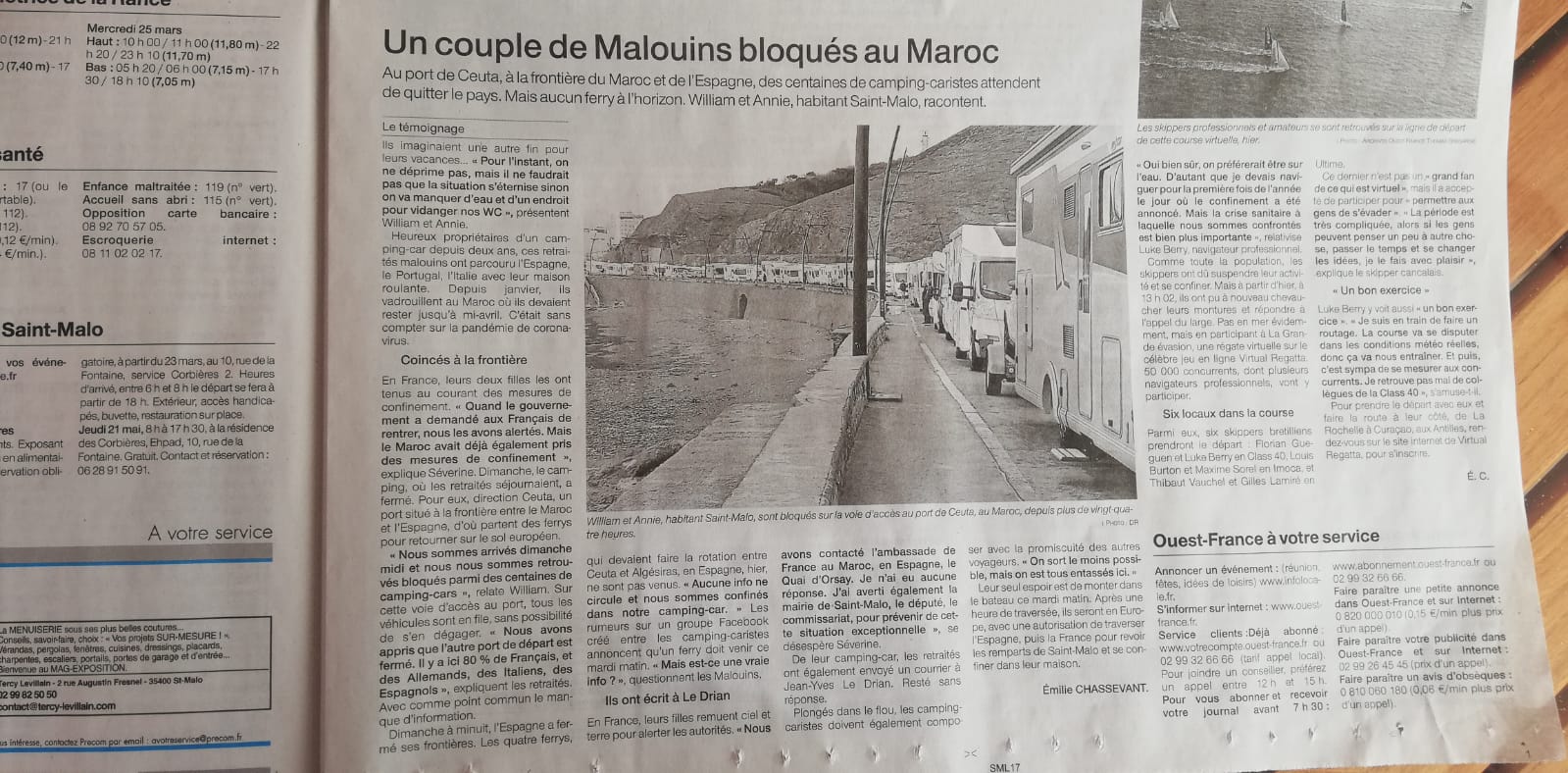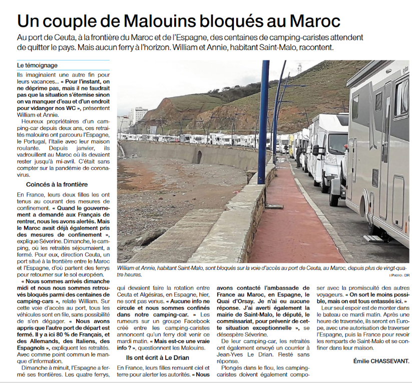 Re cet après-midi le représentant du consul allemand au Maroc est passé. Ce soir le consul français au Maroc est passé pour trouver une solution . Passer en Espagne semble impossible certains camping-cars ont décidé De rester au Maroc sont donc partis sur les campings les autres dont je fais partie sont restés Demain on devrait nous conduire en convoi à Tanger med En attente d’un bateau pour ????? Sete