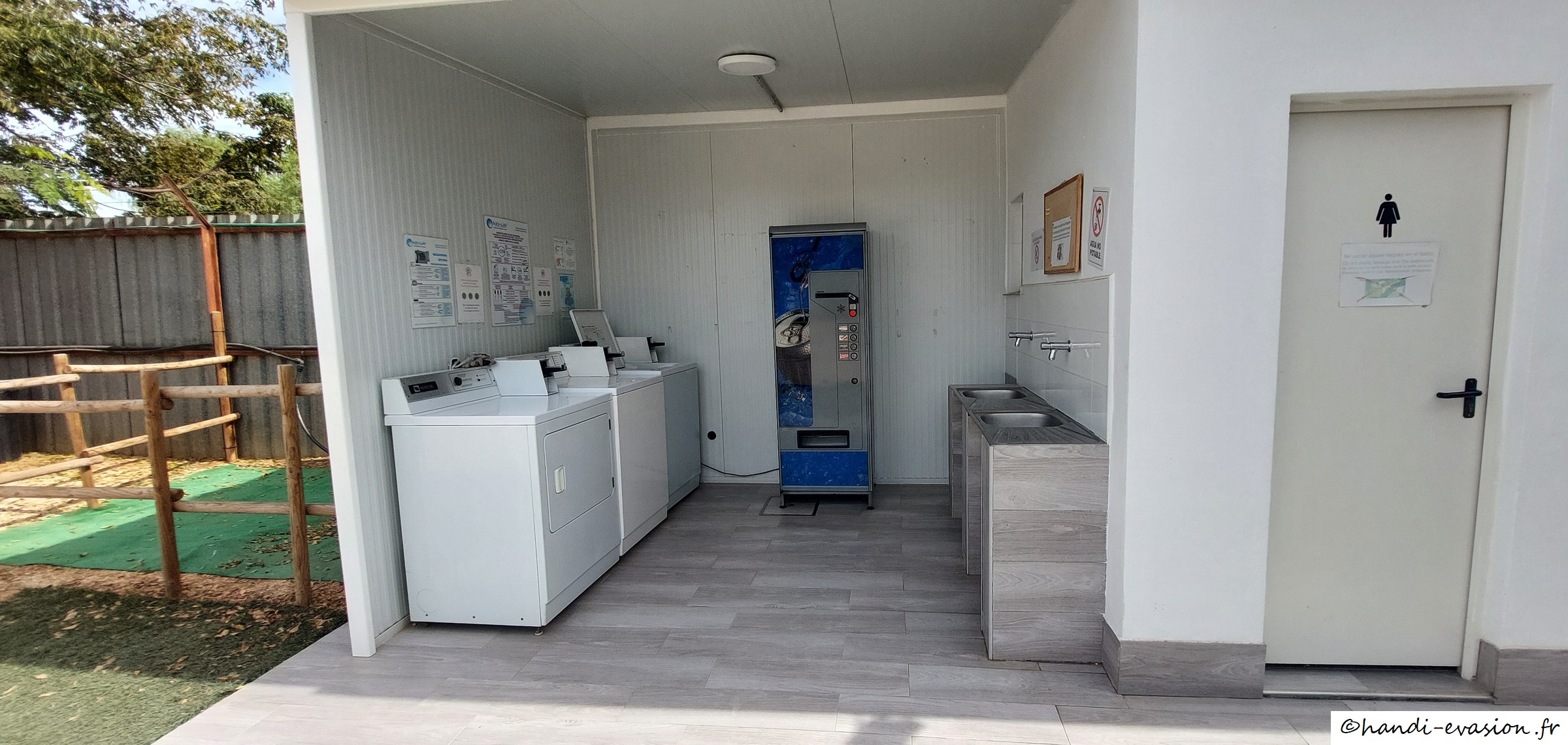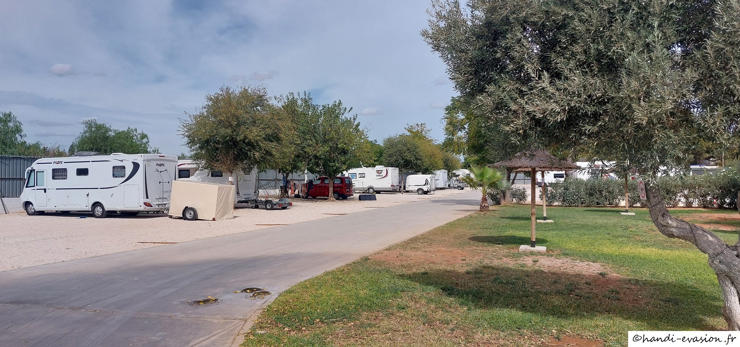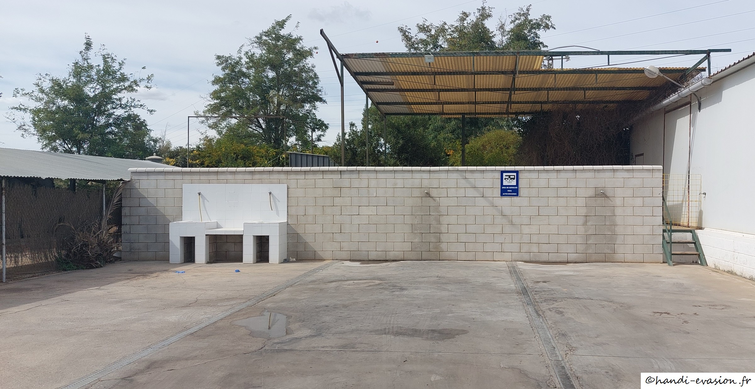 Nous sommes sur une aire qui n'est pas répertoriée sur la carte d'Espagne (ce n'est pas la même), c'est sécurisé, tous les services, 15€ électricité comprise, +3€ si remorque, environ 50 places. A l'accueil ils parlent français.