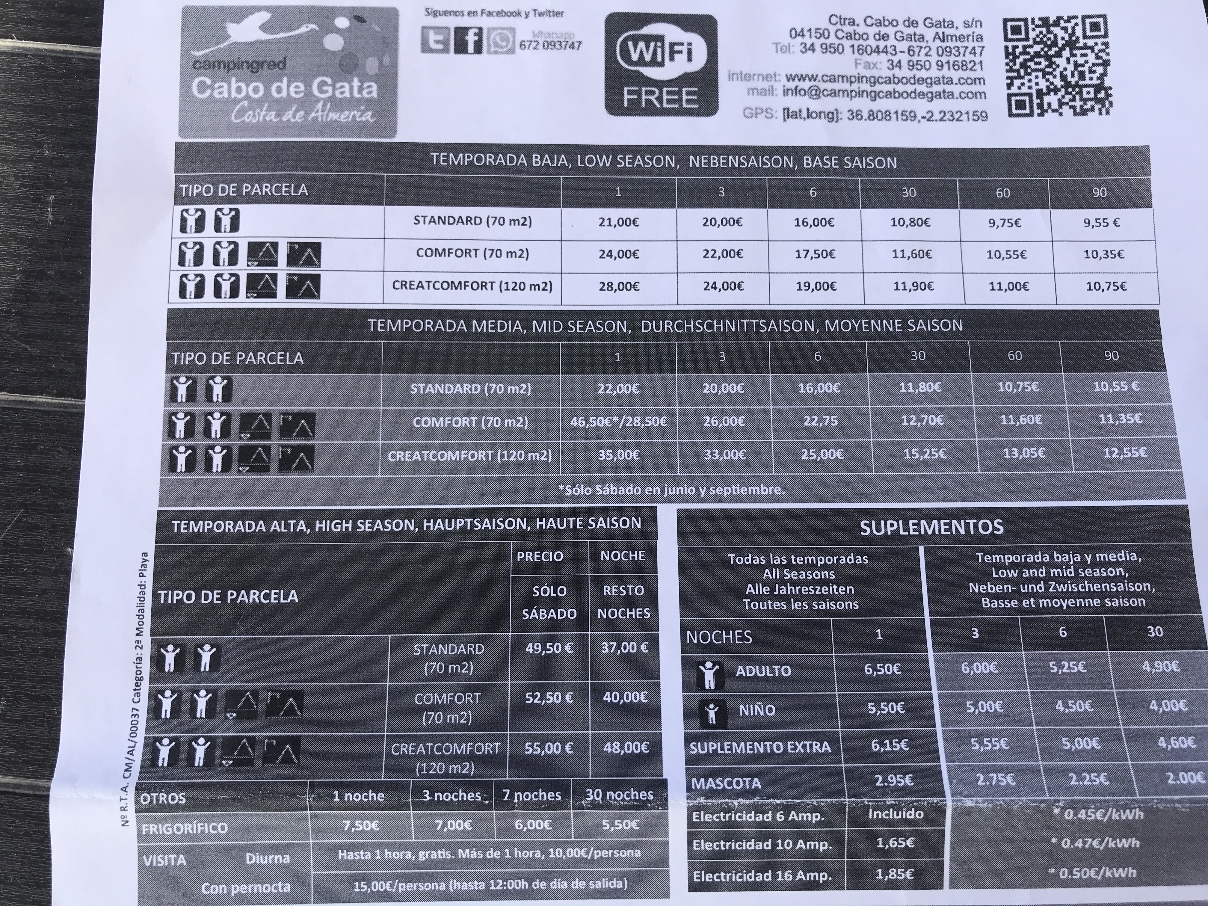 Voilà les tarifs basse saison du camping de cabo de gata; moins cher que le tarif ACSI mais avec minimum 30j Amicalement