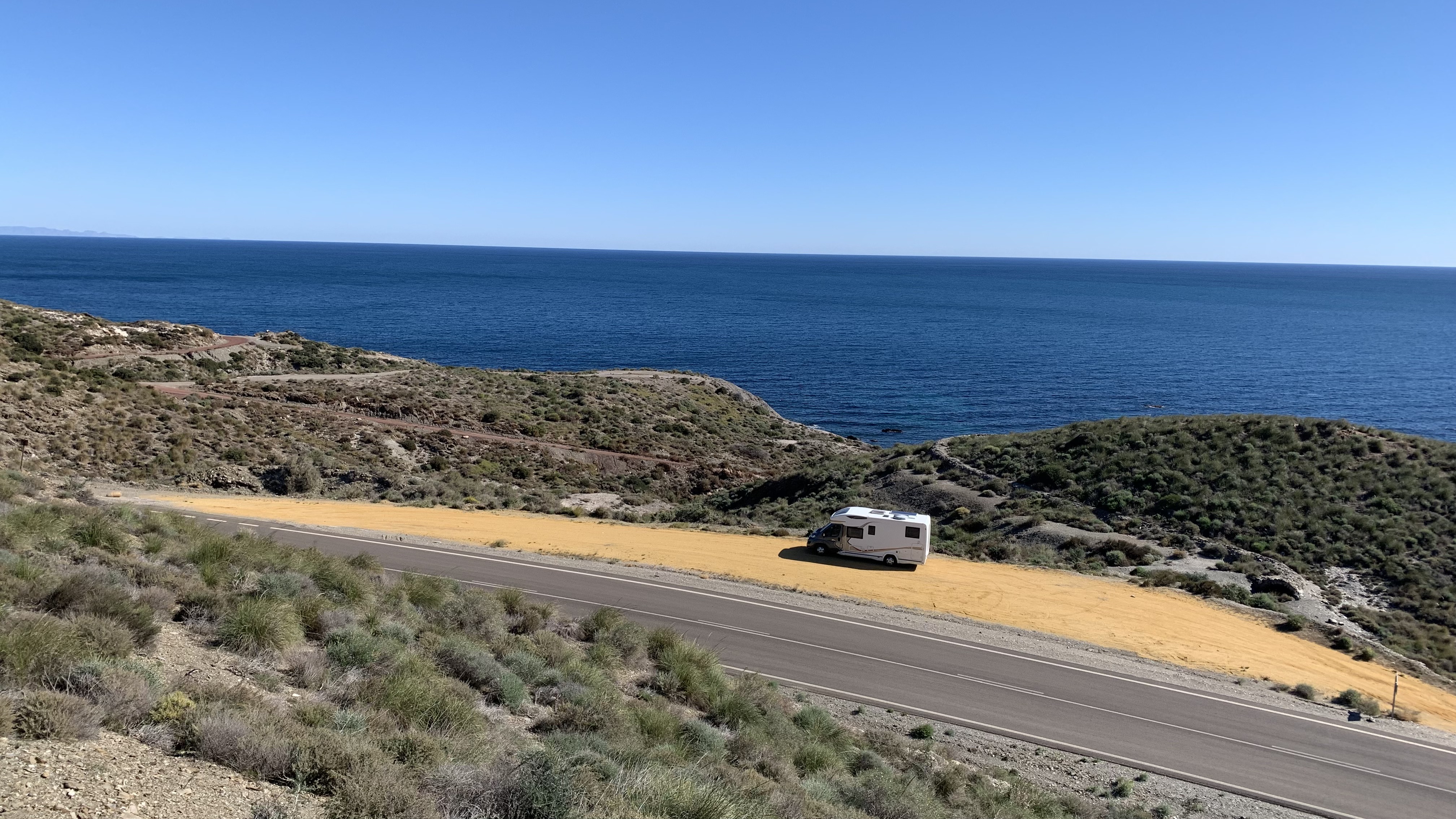 ce matin nous avons quitté Gérard et Monique pour partir plus au sud en direction de Cabo de Gata par une magnifique route côtière à flanc de falaise avec un temps de toute beauté voici un petit aperçu de celle ci, ce soir arrêt sur la plage de Quitapellejos juste avant Garrucha un peu de vent mais rien de bien méchant plage ou nous pouvons marcher des km