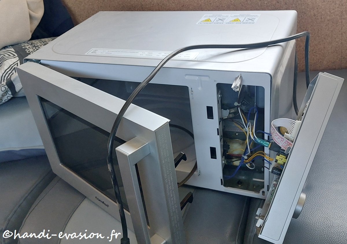 En 4 ans cela n'était jamais arrivé... Ce matin Amaury a oublié d'attacher le micro-ondes, on n'avait que 75 km à faire, à 5 km du camping, gros bruit à l'arrière, ce pauvre micro-ondes ne s'est pas remis de son saut dans le vide, heureusement aucun autre dégât dans le camping-car, il a le ventre à l'air, la porte tordue, RIP.