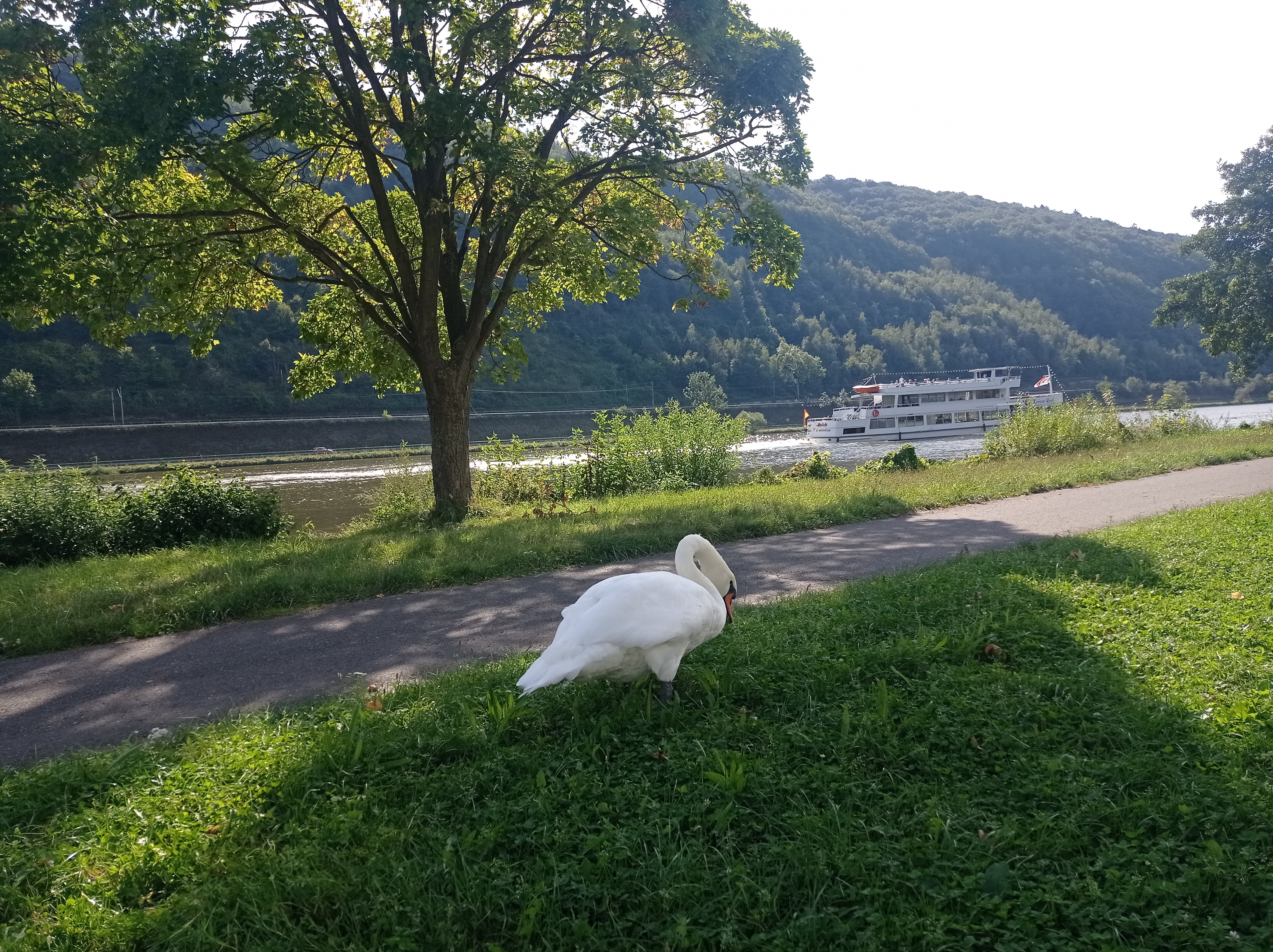 On est sur une aire gazonnée dans un petit village. Cette aire donne directement sur la Moselle. On peut voir ainsi les bateaux et en arrière-plan les trains passer! Il fait un temps beau et chaud.