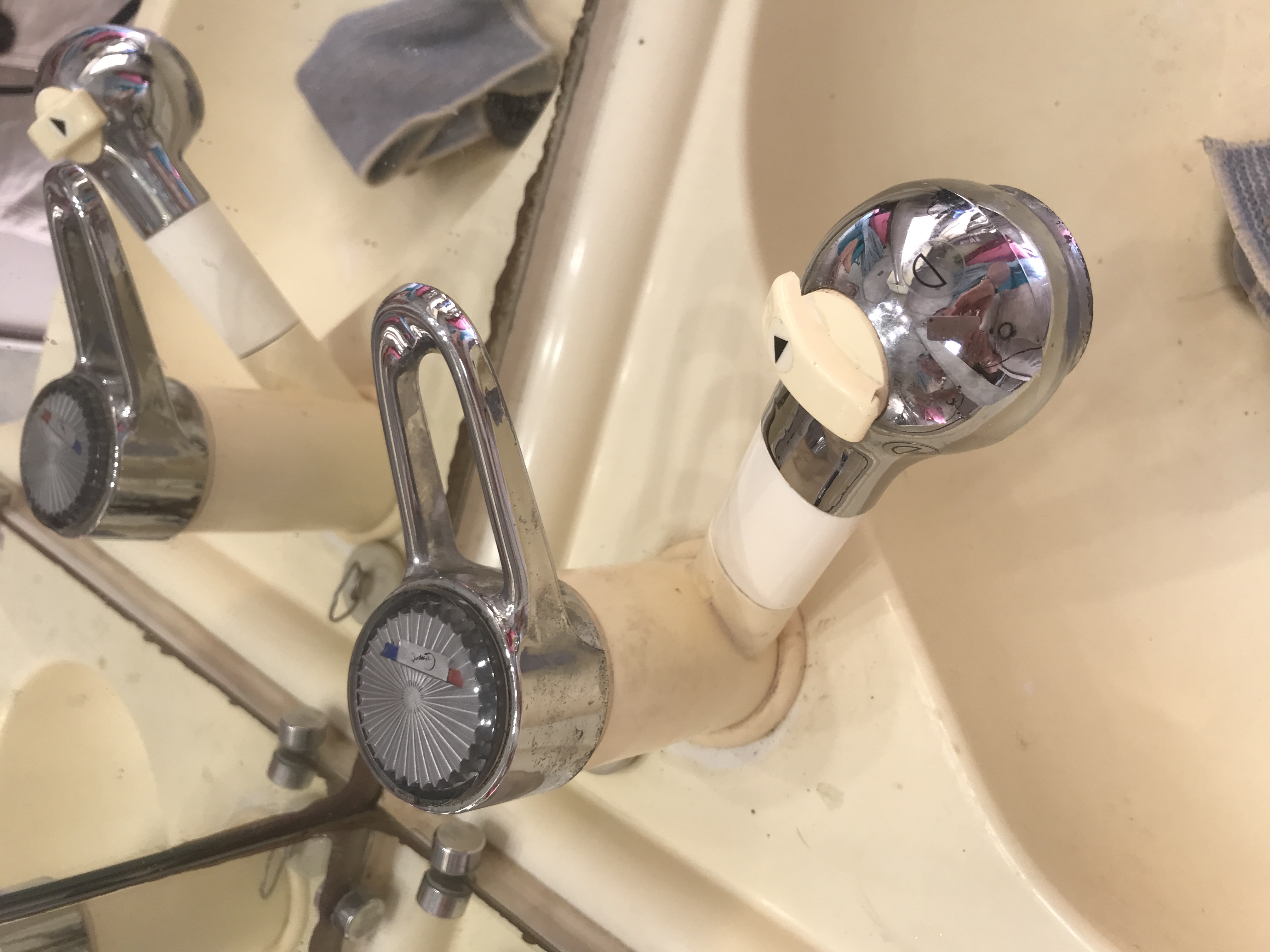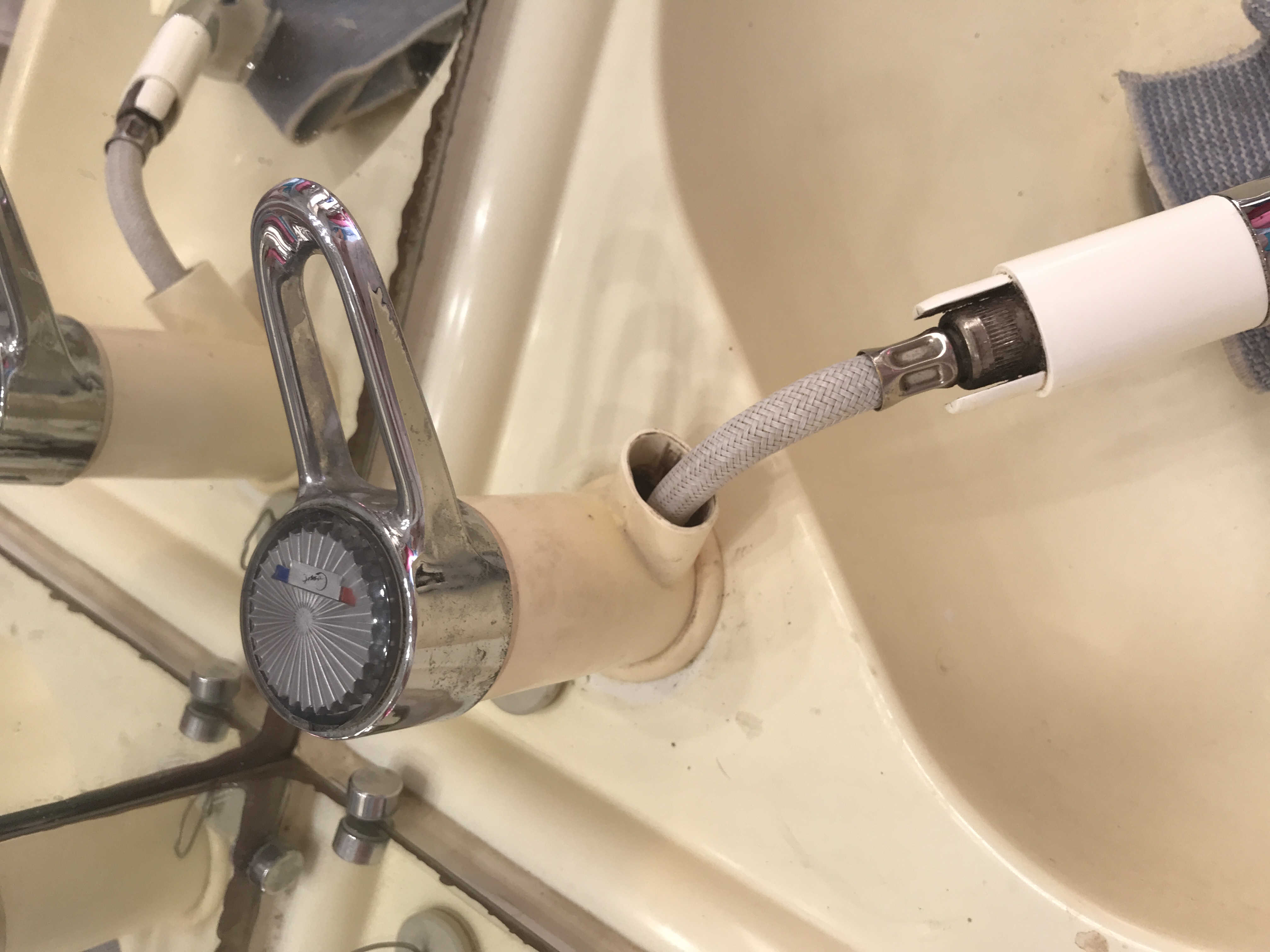 Après 2 jours d’efforts tout est démonté sans casse; finalement nous avons trouvé dans une grande surface un robinet mitigeur avec douchette rétractable conçue pour une salle de bain mais parfaite pour un camping car.
