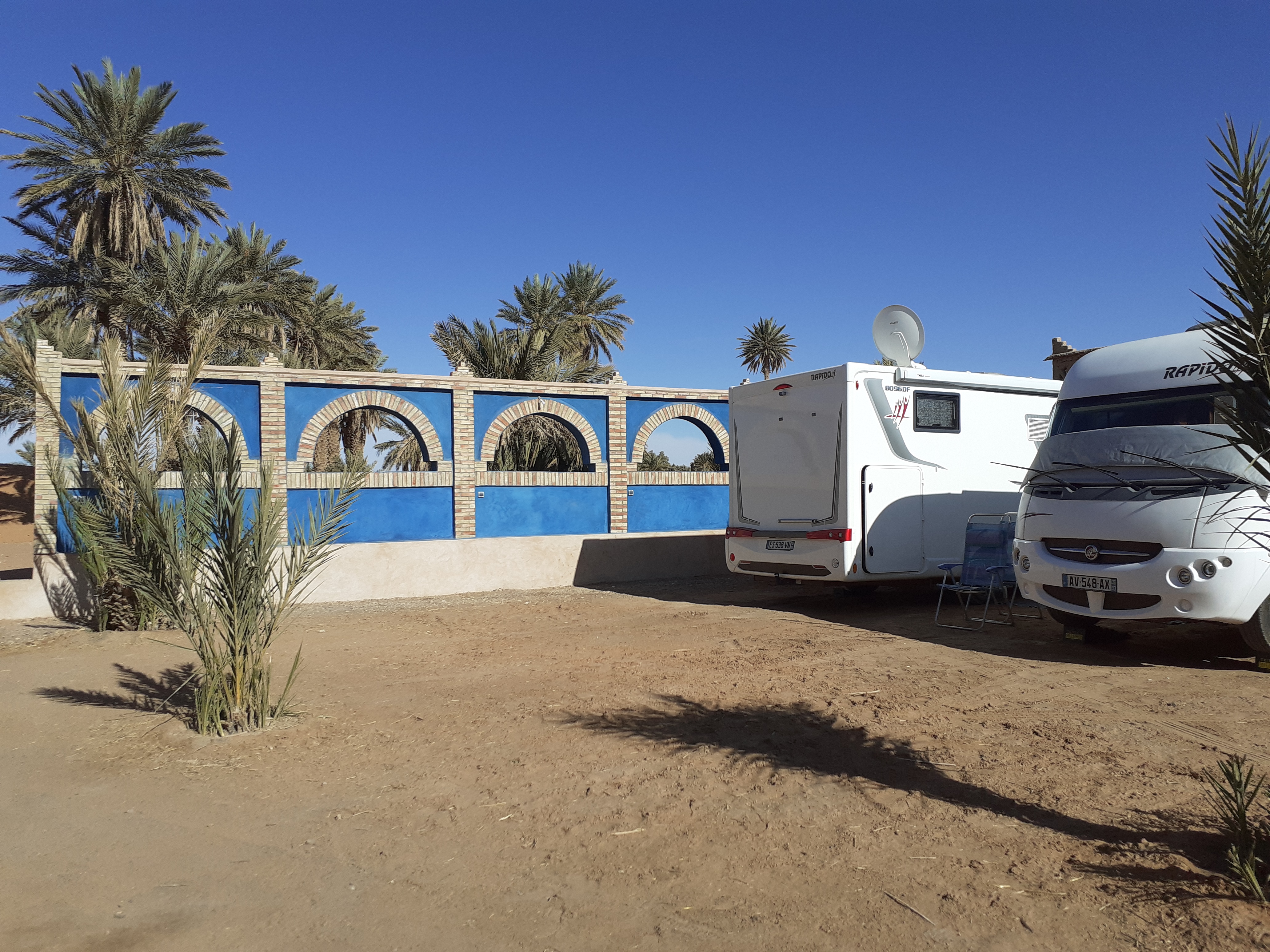 Ici au camping les Oliviers d'Ounara une vingtaine de camping car mais pas mal de départs demain, ça remonte. 100 dh l'a première nuit puis 90 elec 25 dh.