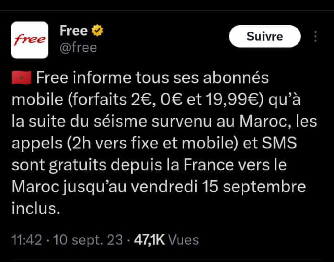 GRATUITÉ des appels vers le Maroc pendant quelques jours suite au séisme.