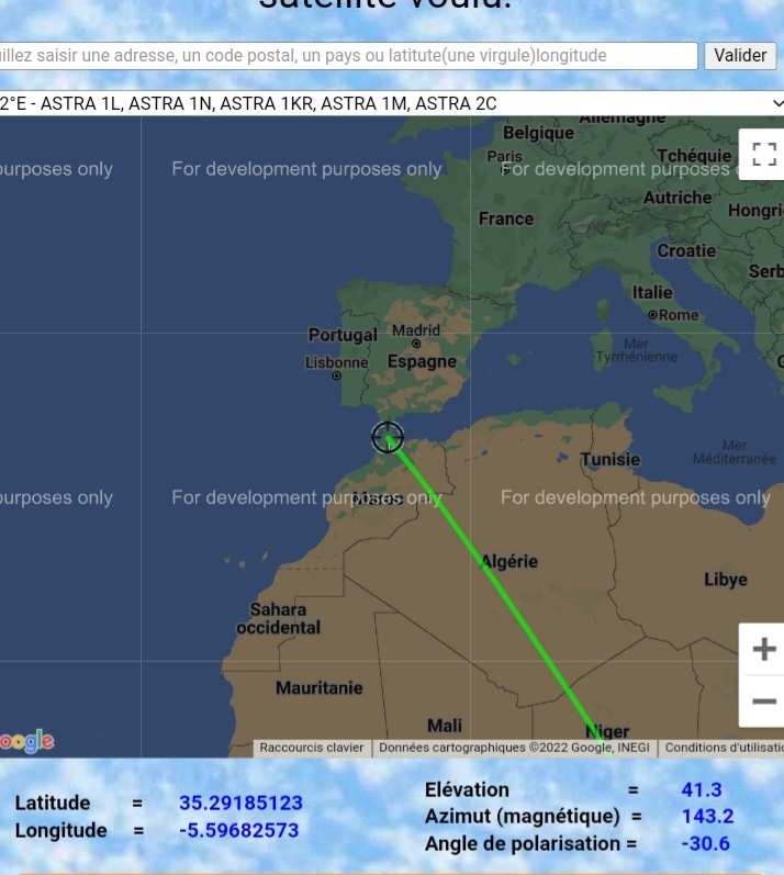 Pour le Maroc je conseille une parabole de 85cm automatique, et un décodeur TNT Strong et se caler sur Astra 19°. La réception jusqu'aux limite du satellite est optimale.